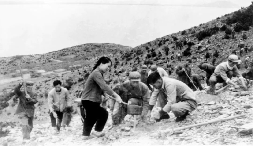 谷文昌(前排右一)与当地群众在荒山石滩造林