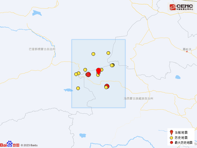 历史地震:根据中国地震台网速报目录,震中周边200公里内近5年来发生3级以上地震共18次,最大地震分别是2024年4月4日在青海海西州茫崖市发生的5.5级地震(距离本次震中66公里)和2022年10月19日在青海海西州茫崖市发生的5.5级地震(距离本次震中104公里),历史地震分布如图。