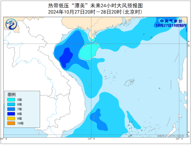 大风预报:27日20时至28日20时,受冷空气和潭美减弱后的热带低压影响,南海北部和西部海域、琼州海峡、北部湾以及广东西部沿海、广西沿海、海南岛沿海将有6-7级大风、阵风8-9级,其中北部湾偏南海域风力可达8级、阵风9-10级。