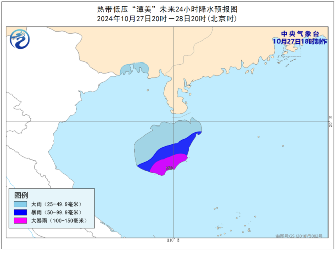 降水预报:27日20时至28日20时,海南岛大部等地将有大雨,海南岛东南部部分地区有暴雨或大暴雨。