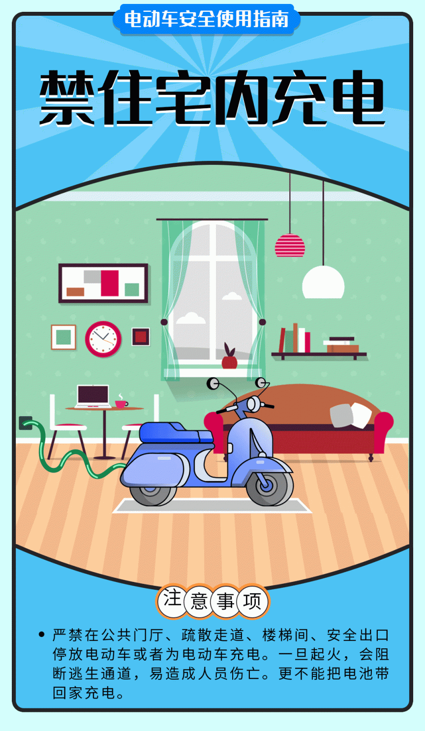 3.电动自行车充电应远离易燃易爆物品,请勿在低温、高温环境或室内、楼梯间、过道充电,不能飞线充电或一板多充。充电过程中,严禁在充电器上覆盖任何物品。