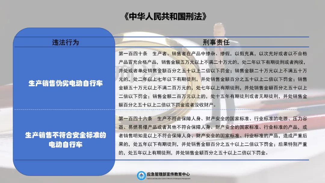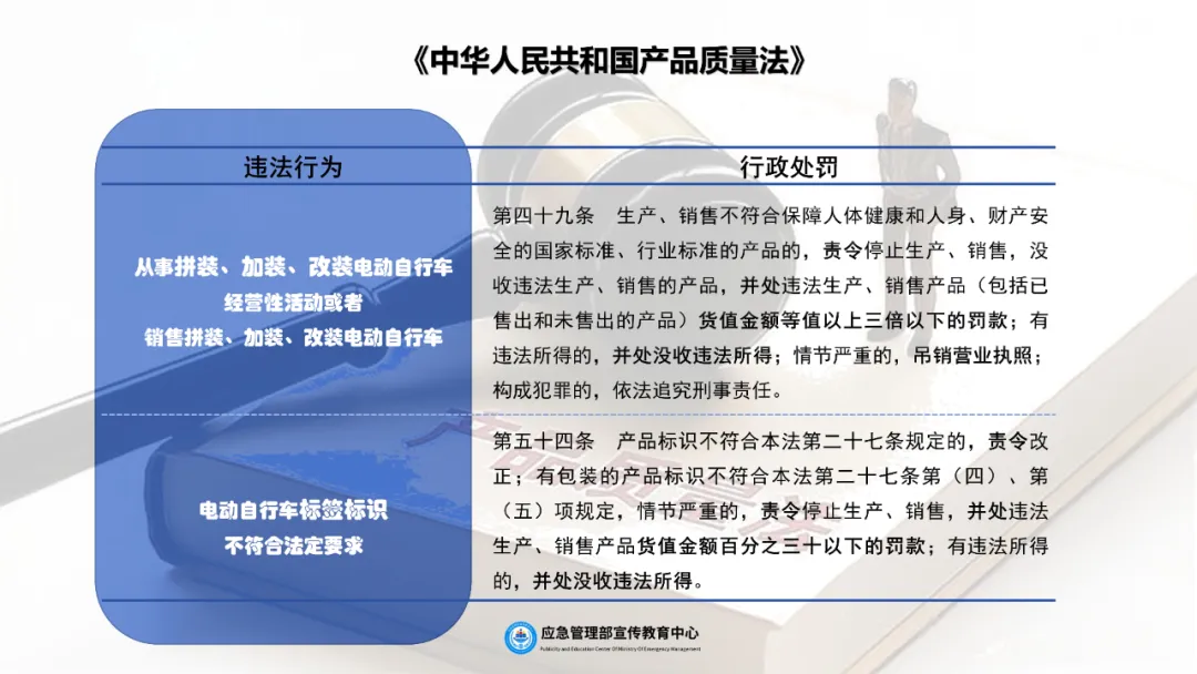 各地市场监管部门依据《中华人民共和国产品质量法》《中华人民共和国标准化法》《中华人民共和国认证认可条例》等法律法规,督促电动自行车生产销售单位全面落实质量安全主体责任,在生产、流通环节加强电动自行车产品质量监督检查,依法查处违法行为。聚焦认证质量,持续加强电动自行车认证活动、认证结果日常监督管理,督促认证机构及其认证人员对认证结果负责,依法查处违规认证机构、实验室。