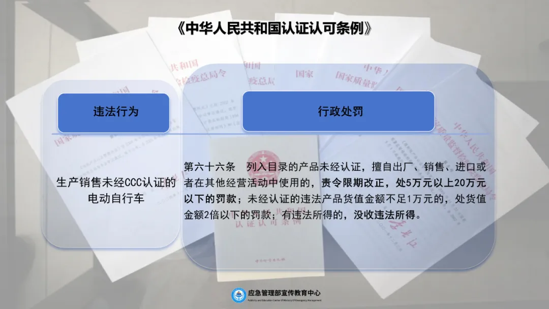 2.电动自行车依法实施强制性产品认证(CCC认证),需查看产品的CCC认证证书以及产品合格证信息,并与实物进行核对。