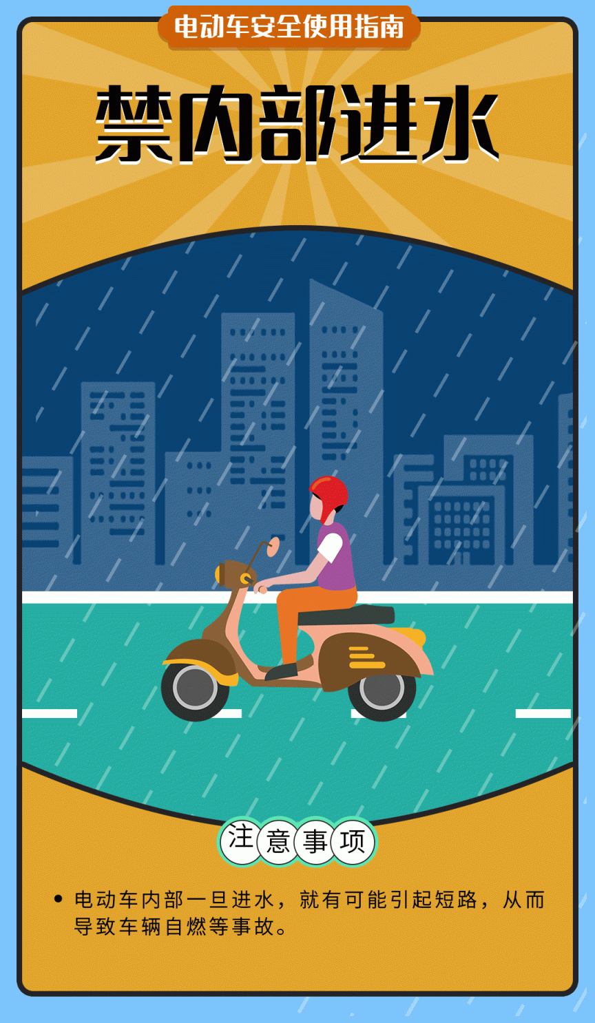 5.行驶中,不要将充电器放在车上,避免路面颠簸导致充电器内部发生短路,充电时引起自燃;避免在雨天、积水路段行驶,以防电机进水,充电时短路着火。