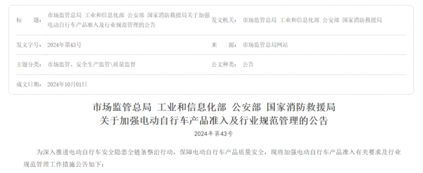 《关于加强电动自行车产品准入及行业规范管理的公告》