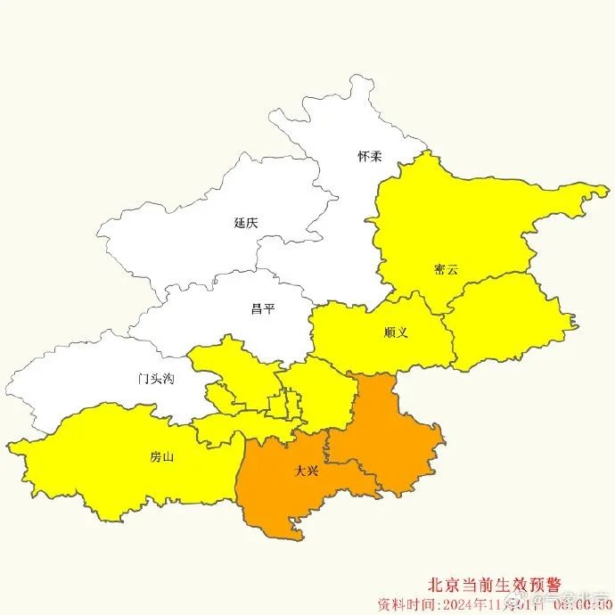 目前,我市城区、东部及南部各区处于大雾黄色预警中,大兴、通州处于大雾橙色预警中。我市平原地区能见度不足1公里,大兴、通州局地小于200米。