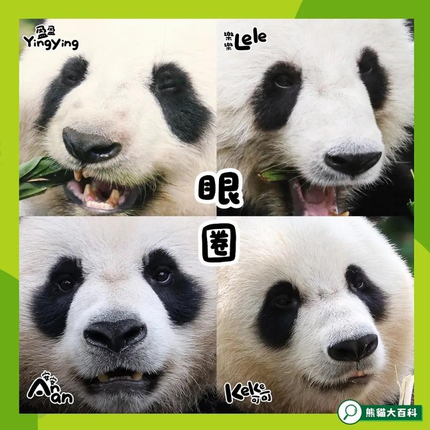 大熊猫盈盈的黑眼圈是8字型的,乐乐的黑眼圈比较圆,安安的黑眼圈像葫芦,可可的黑眼圈则是类似肥皂的形状。