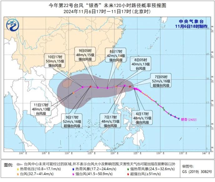 未来,银杏可能在后天移入南海东北部海面。进入南海后,可能受到低空东北风控制,银杏将向西南折走。