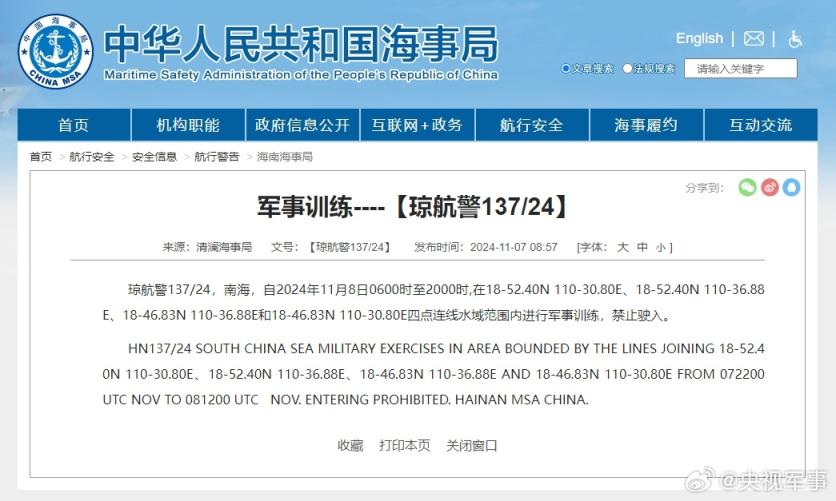 据中国海事局网站消息,清澜海事局发布航行警告,11月8日6时至20时,南海部分海域进行军事训练,禁止驶入。