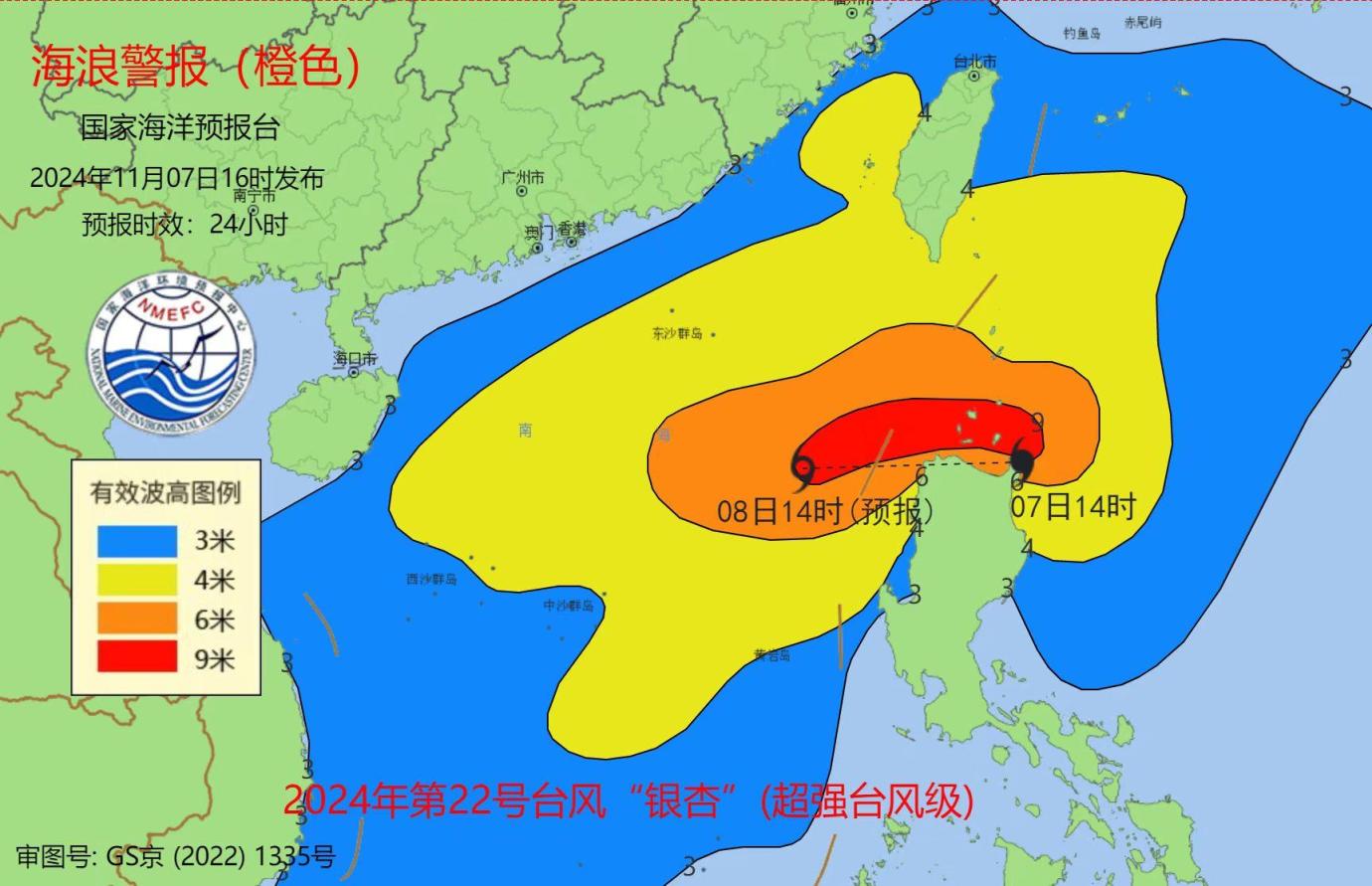 受今年第22号台风银杏(超强台风级)和冷空气的共同影响,预计11月7日夜间到8日白天,南海北部、中部、巴士海峡将出现6到9米的狂浪到狂涛区,近海海域海浪预警级别为橙色;福建、广东东部、海南东部近岸海域将出现2到3米的中浪到大浪,近岸海域海浪预警级别为蓝色。请在上述海域作业的船只注意安全,沿海各有关单位提前采取防浪避浪措施。