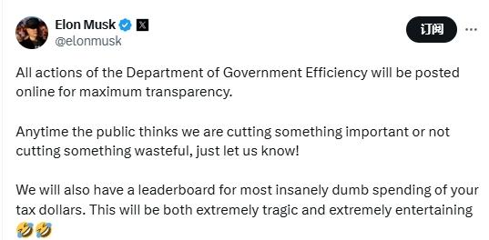 据外媒报道,当地时间12日,美国企业家埃隆马斯克在社交媒体平台X发文称,拟成立的政府效率部(DOGE)将在网上发布其所有行动,以实现最大透明度。