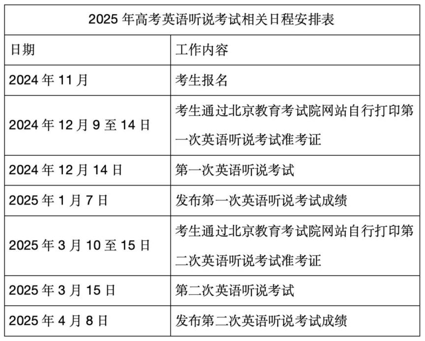 考生可于2025年1月7日在北京教育考试院网站(www.bjeea.cn)查询2025年高考第一次英语听说机考成绩,2025年4月8日查询第二次英语听说机考成绩。