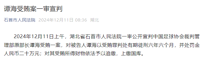 2024年12月11日上午,湖北省石首市法院一审公开宣判中国足球协会裁判管理部原部长谭海受贿一案,对被告人谭海以受贿罪判处有期徒刑六年六个月,并处罚金人民币20万元;对其受贿所得财物依法予以追缴,上缴国库。