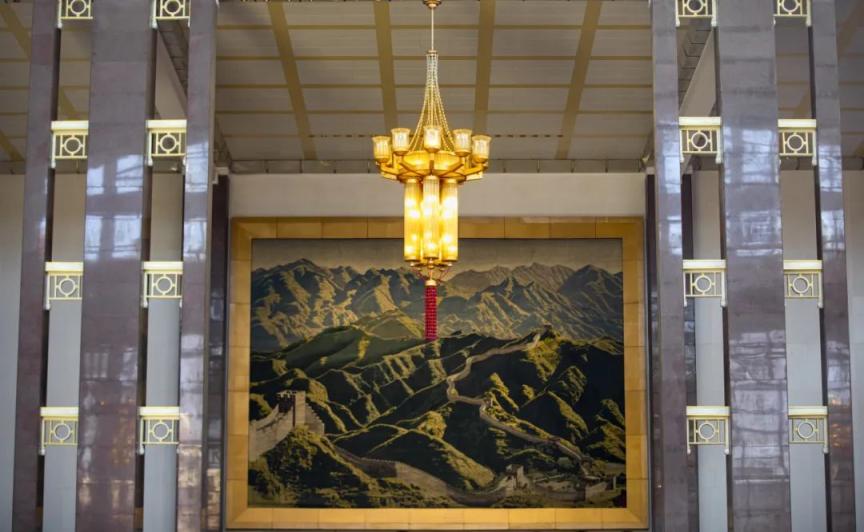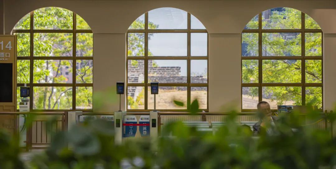 在第8候车室门口正上方的巨幅挂毯中,山峦起伏,长城逶迤,壮丽的景色拨动每位驻足旅客的心弦;在这个候车室的尽头,透过五扇拱形窗户,明城墙的遗迹映入眼帘。