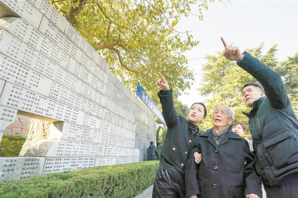 今年是南京大屠杀87周年,也是国家公祭日设立10周年。图为近日,在南京大屠杀死难者家庭祭告活动中,南京大屠杀幸存者艾义英和家人在纪念馆的哭墙上寻找家人姓名。 新华社记者 李博 摄