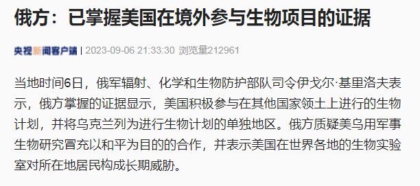 2023年6月,基里洛夫表示,俄方掌握的证据显示,美国积极参与在其他国家领土上进行的生物计划,并将乌克兰列为进行生物计划的单独地区。俄方质疑美乌用军事生物研究冒充以和平为目的的合作,并表示美国在世界各地的生物实验室对所在地居民构成长期威胁。