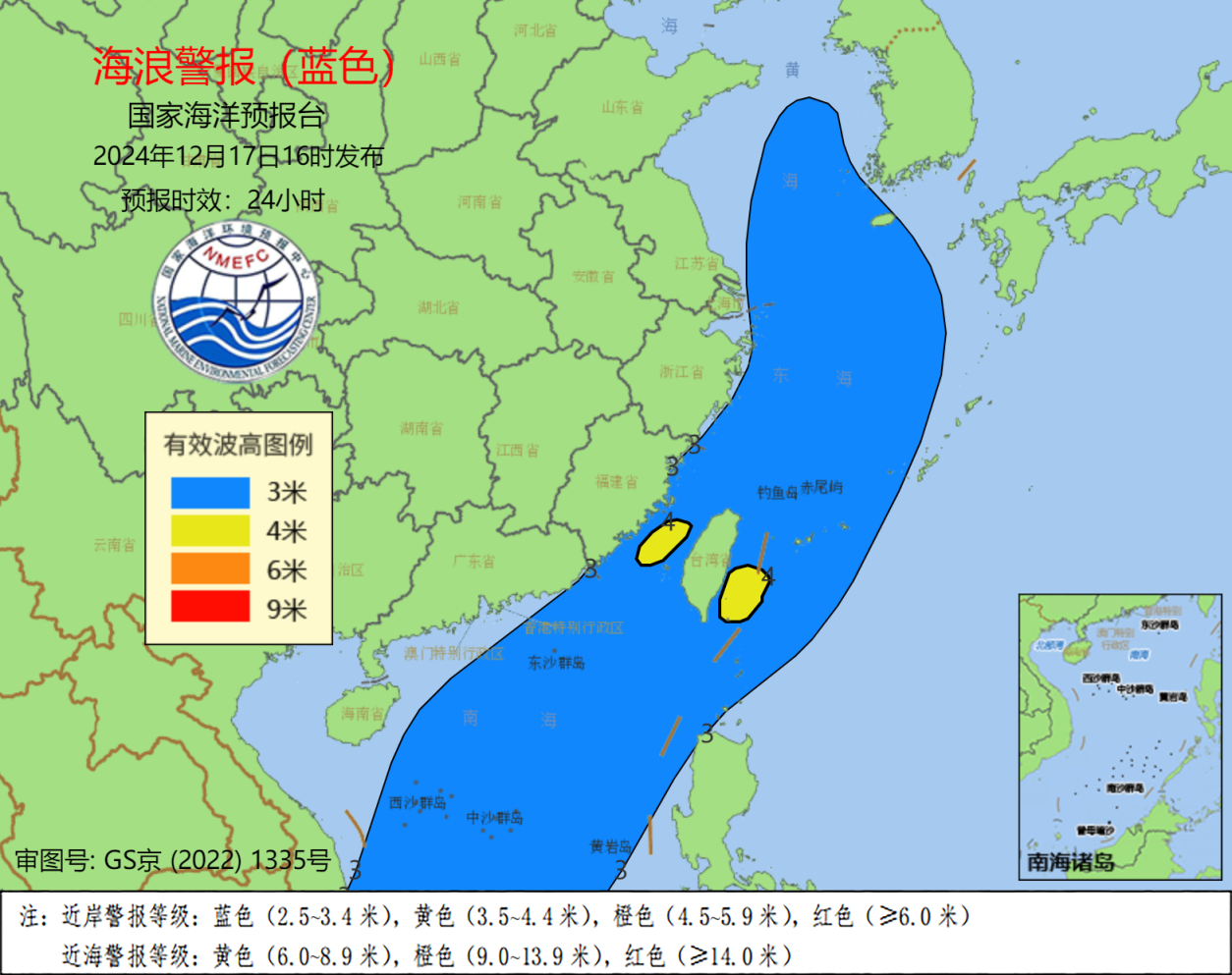 记者今天(17日)从自然资源部获悉,预计12月18日至20日,黄海、东海、台湾海峡、南海将先后出现一次大浪以上过程,国家海洋预报台根据《海洋灾害应急预案》发布海浪蓝色警报。