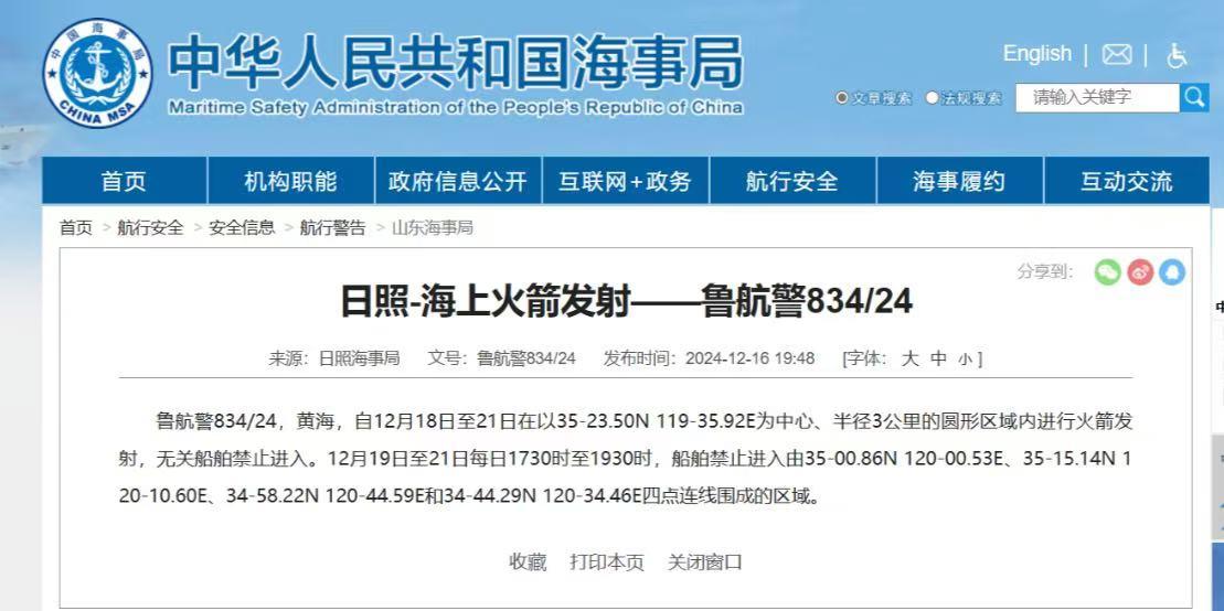 近日,日照海事局发布通告,自12月18日至21日在黄海部分海域进行火箭发射,无关船舶禁止进入。