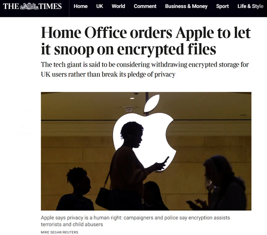 据美国《华盛顿邮报》7日援引消息人士说法报道称,英国安全官员已经秘密下令,要求美国苹果公司开后门,允许英国政府获取苹果用户上传至其云存储的所有内容。