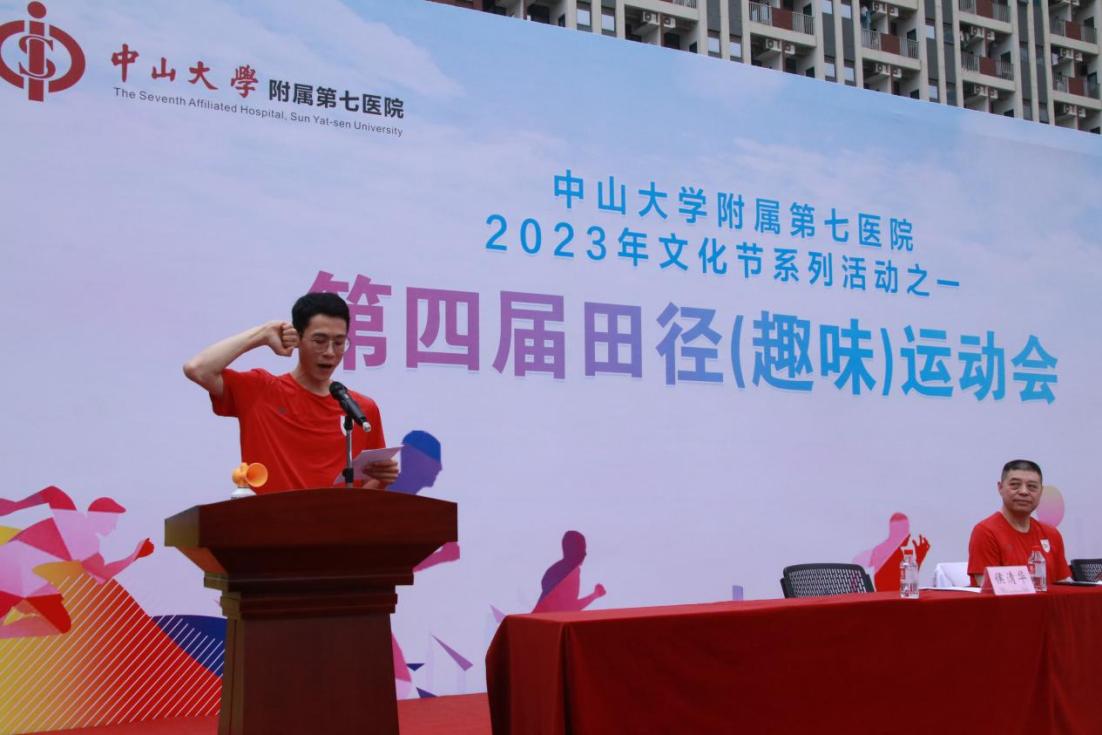 游展高副书记代表医院党委、班子成员致辞。他表示,希望广大职工在本次运动会中秉承中山七院人的团队精神,弘扬中华体育精神,在比赛中坚定自信,努力拼搏,赛出成绩;希望全院职工加强锻炼,通过选拔代表医院参加校运会的运动员做好充分的准备,在校运会中取得优异赛绩。