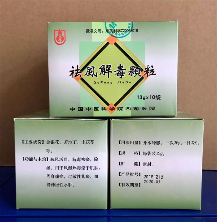 3)祛风解毒颗粒:专治荨麻疹及风显热毒引起的全身瘙痒,过敏性紫癜,血管神经性水肿。