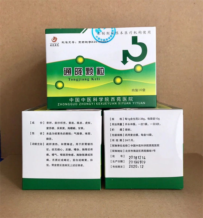 4)通降颗粒:舒肝和胃,抑酸止痛,用于非糜烂性胃食管反流病,肝胃不和,烧心反酸,胸骨后疼痛,嗳气(打嗝儿),嘈杂,胃痛,胃胀,早饱,咽部异物感,情绪烦躁,抑郁,胸胁胀满或胀痈。