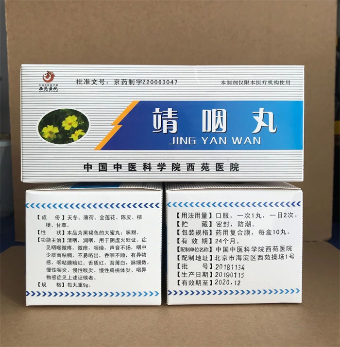 5)靖咽丸:清咽、润咽,用于咽喉微疼,微痒、咽燥、声音不扬,咽中少痰而黏稠,不易易咯出,吞烟。