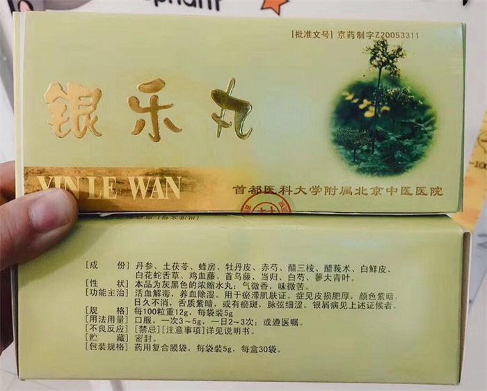 1)银乐丸:专治银屑病,北京中医医院自制。活血解毒、润肤除湿,用于瘀滞肌肤症,银屑病。