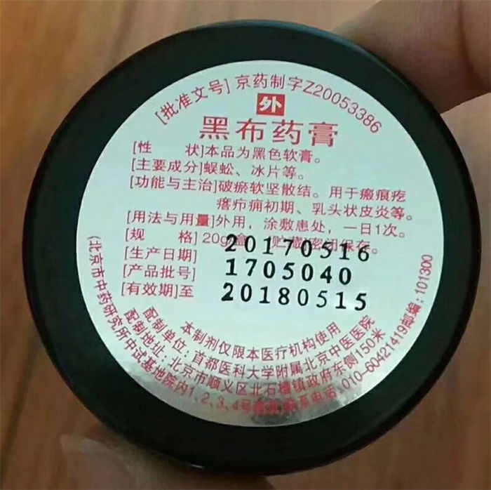 4)黑布药膏:破瘀散结,用于瘢痕疙瘩疖痈初期,乳头状皮炎。