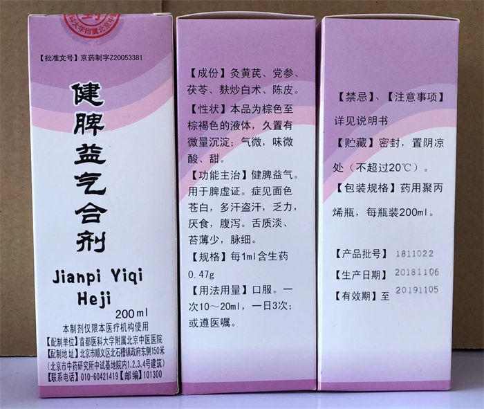 8)健脾益气合剂:健脾益气,用于脾虚血少,面色苍白,多汗盗汗,乏力,易感厌食,腹泻。