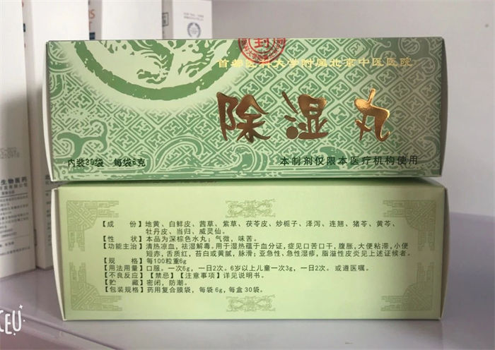 10)除湿丸:清热凉血,祛湿解毒,用于湿热蕴于血分证,症见口苦口干,腹胀,大便粘滞,小便短苏,舌质红,苔白或黄腻,脉滑,亚急性、急性湿疹,脂溢性皮火见上述。