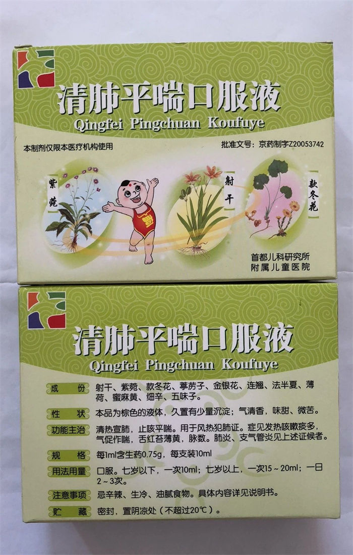 4)清肺平喘口服液: 清热宣肺,止咳平喘。用于风热犯肺证。症见发热咳嗽痰多,气促作喘,舌红苔薄黄,脉数。肺炎、支气管炎见上述证候者。