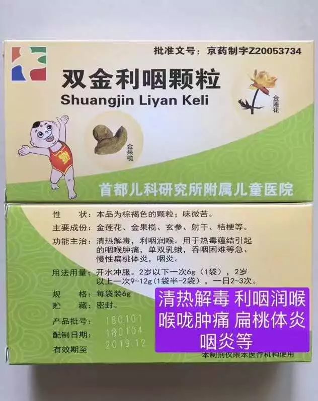 6)双金利咽颗粒:清热解毒,利咽润喉。用于热毒蕴结引起的咽喉肿痛,单双乳蛾,吞咽困难等急、慢性扁桃体炎,咽炎。