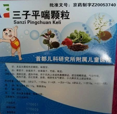 7)三子平喘颗粒:清热化痰,退热平喘。用于风热上攻或热毒壅肺证。症见咳嗽痰盛,气促作喘,高热不退,舌红苔黄,脉数。喘息性支气管炎、小二肺炎见上述证候者。