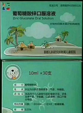 9)葡萄糖酸锌口服液:用于小儿缺锌引起的食欲不佳、厌食、发育不良、异食癖,口腔溃疡,伤口不愈合等症。