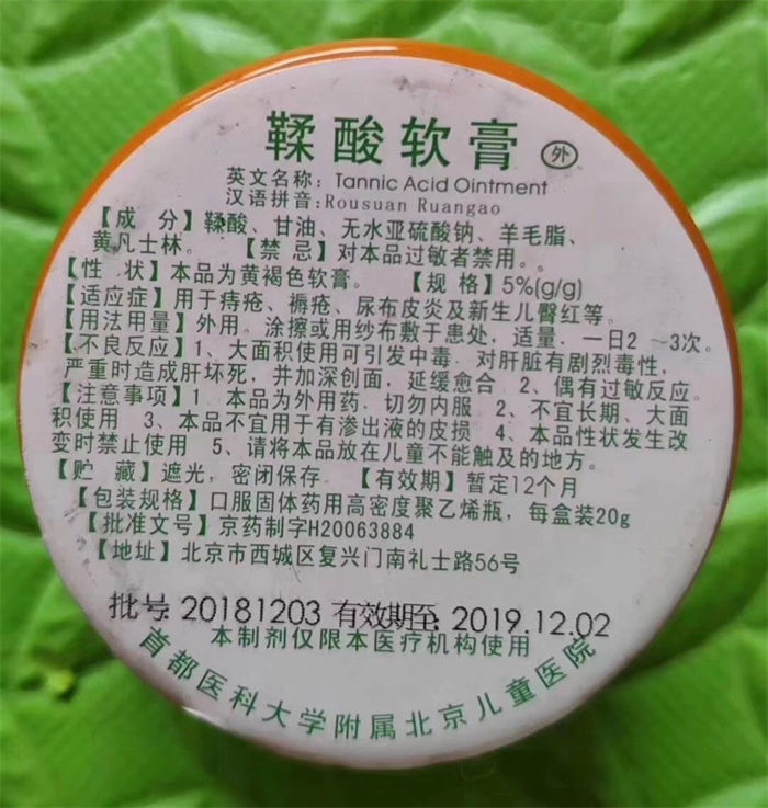 鞣酸软膏:用于痔疮、褥疮、尿布皮炎及新生儿臀红等。外用。
