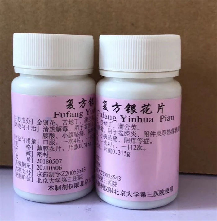 7)复方银花片(抗感染二号):用于盆腔炎、小腹坠痛、附件炎等、热毒壅盛所致赤白带下,腰酸、小腹坠疼、阴痒等症。主治妇科病,功效:清热解毒, 主要成份:金银花、蒲公英、苦地丁。一瓶60片,口服每日2次,每次4片。