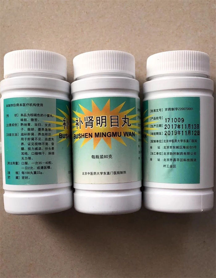 2)补肾明目丸:滋补肝肾,养血明目。北京东直门中医院自制。用于肝肾不足,血虚失养,证见视物不清、昏朦,视力减退,伴有头晕耳鸣,口燥咽干,脉细无力等。