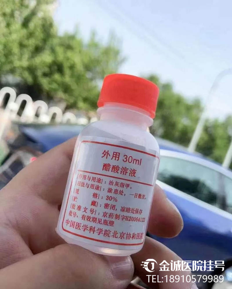 十七、醋酸溶液 得了灰指甲,使用协和自制醋酸溶液。效果看得见!功能与主治:具有杀灭真菌的作用,用于指甲真菌病。用法与用量:刮甲板后,涂患处,一日3-4次。注意事项:本品不得与碱类,碳酸盐、水杨酸盐、苯甲酸盐等配伍。用于治疗灰指甲,杀灭指甲真菌,帮助新指甲生成。是协和医院唯一一款治疗灰指甲的良药。