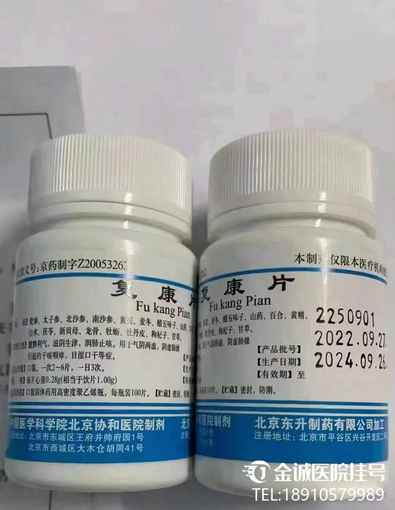 二十一、复康片 干咳咽痒就用北京协和复康片!协和医院自制特效药。健脾利气,滋阴生津。润肺止咳。用于气阴两虚。阴虚肺燥引起的干咳咽痒。目涩囗干。一瓶一百片。一次2-6片。一天3次