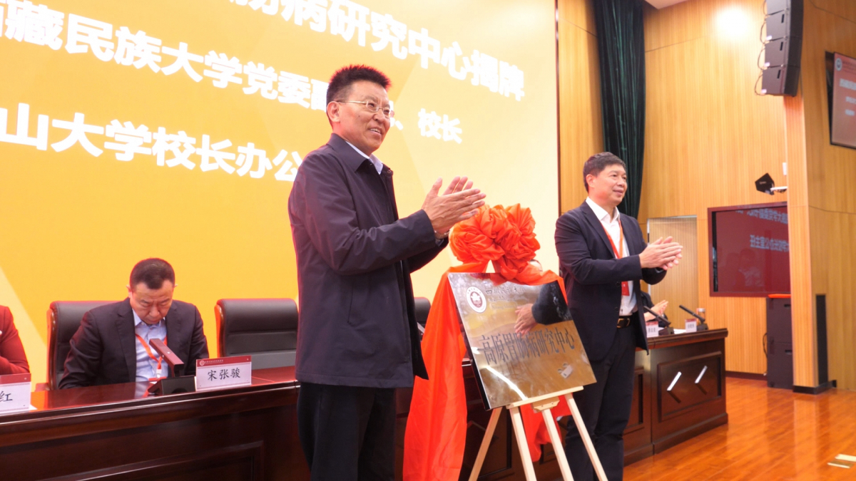 10月14日上午,举行了西藏民族大学高原胃肠病研究中心揭牌仪式。西藏民族大学校长罗旺次仁和中山大学校长办公室主任杨建林共同为高原胃肠病研究中心揭牌。揭牌仪式由西藏民族大学党委常委、副校长焦忠武主持。