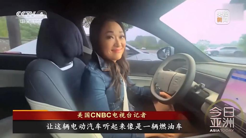 美国CNBC电视台记者:中国的电动汽车通常会配备很多附加功能,例如,我可以给座椅通风来应对夏季的炎热。我可以调整设置,让这辆电动汽车听起来像是一辆燃油车。我还可以让AI助手帮我停车,真是非常方便。