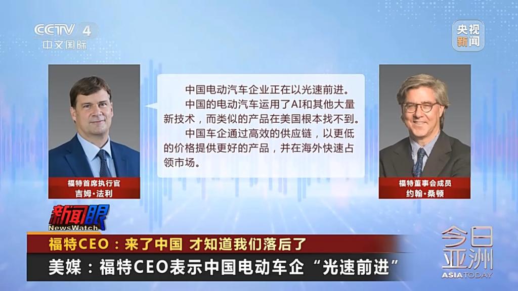 美媒:福特CEO表示中国电动车企光速前进
