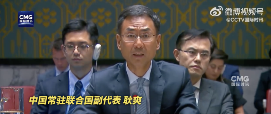 中国常驻联合国副代表耿爽16日在安理会巴以问题公开会上发言 图源:@CCTV国际时讯