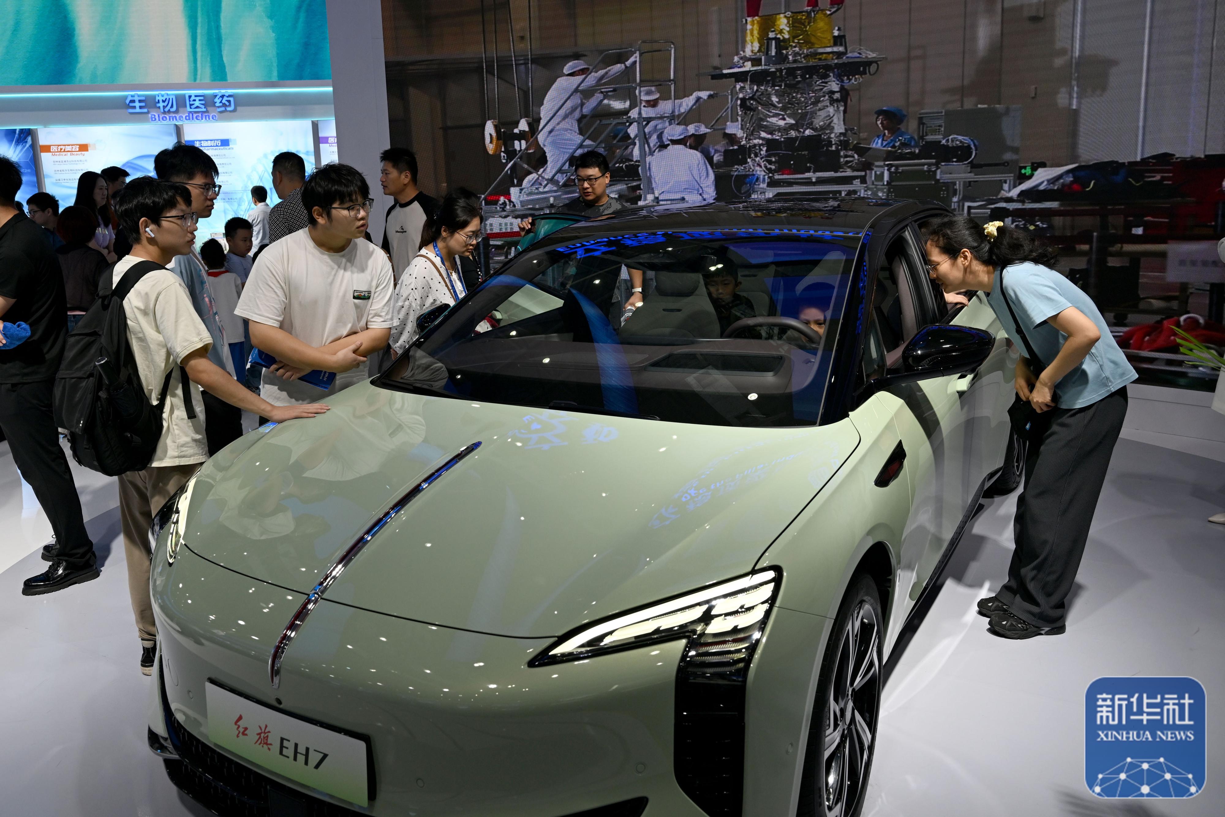 9月21日,在2024世界制造业大会上,人们参观体验红旗EH7新能源汽车。