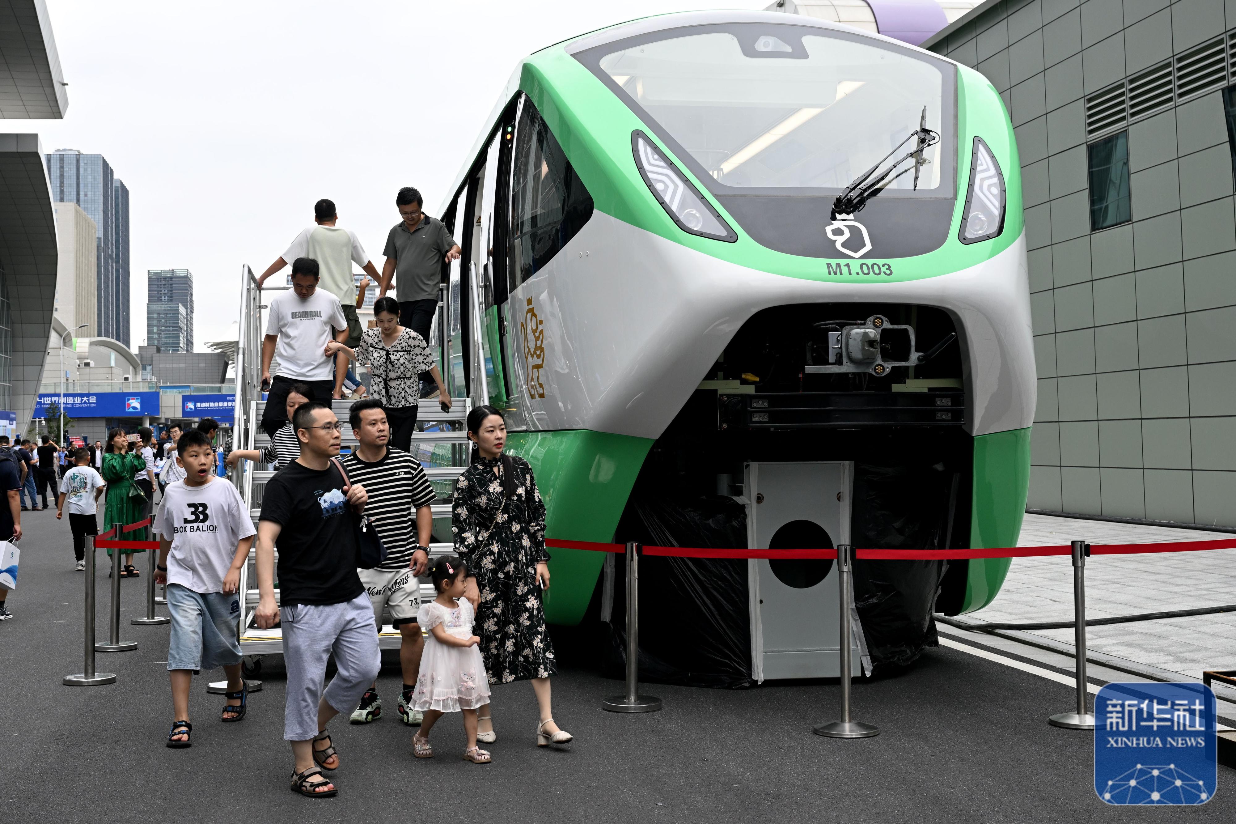 9月21日,在2024世界制造业大会上,人们参观体验一款跨座式单轨列车。