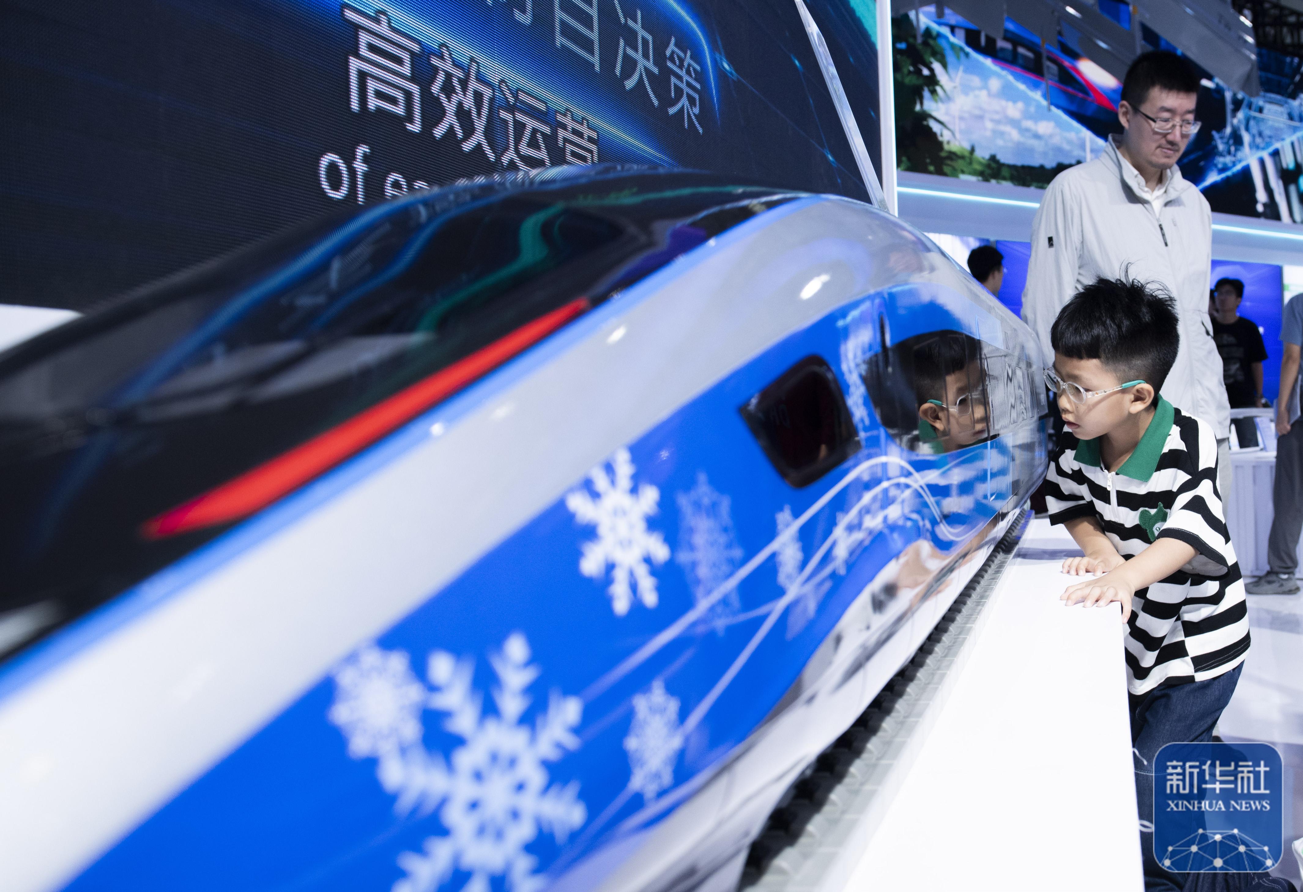 9月21日,小朋友在2024世界制造业大会上参观一款智能动车组模型。