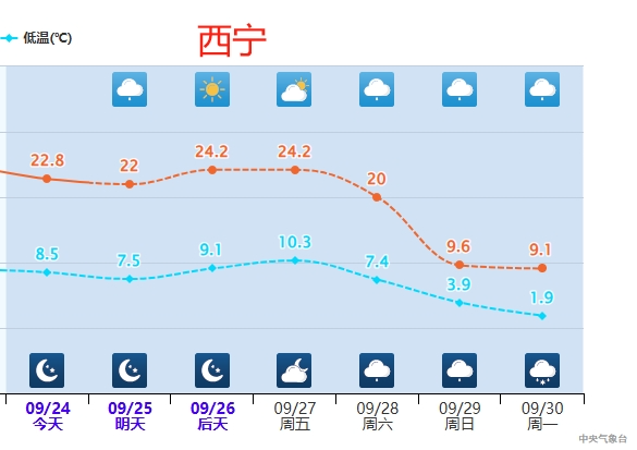 城市中,西宁27日最高气温还有24℃左右,29日降至10℃以下,30日至10月1日早晨最低气温更是直逼冰点,仿佛两天时间便一脚跨入冬天。而今年高温酷热突出的重庆,27日至29日还将连续三天重返高温,30日最高气温将降到27℃左右,可能会由此告别今年的高温季。