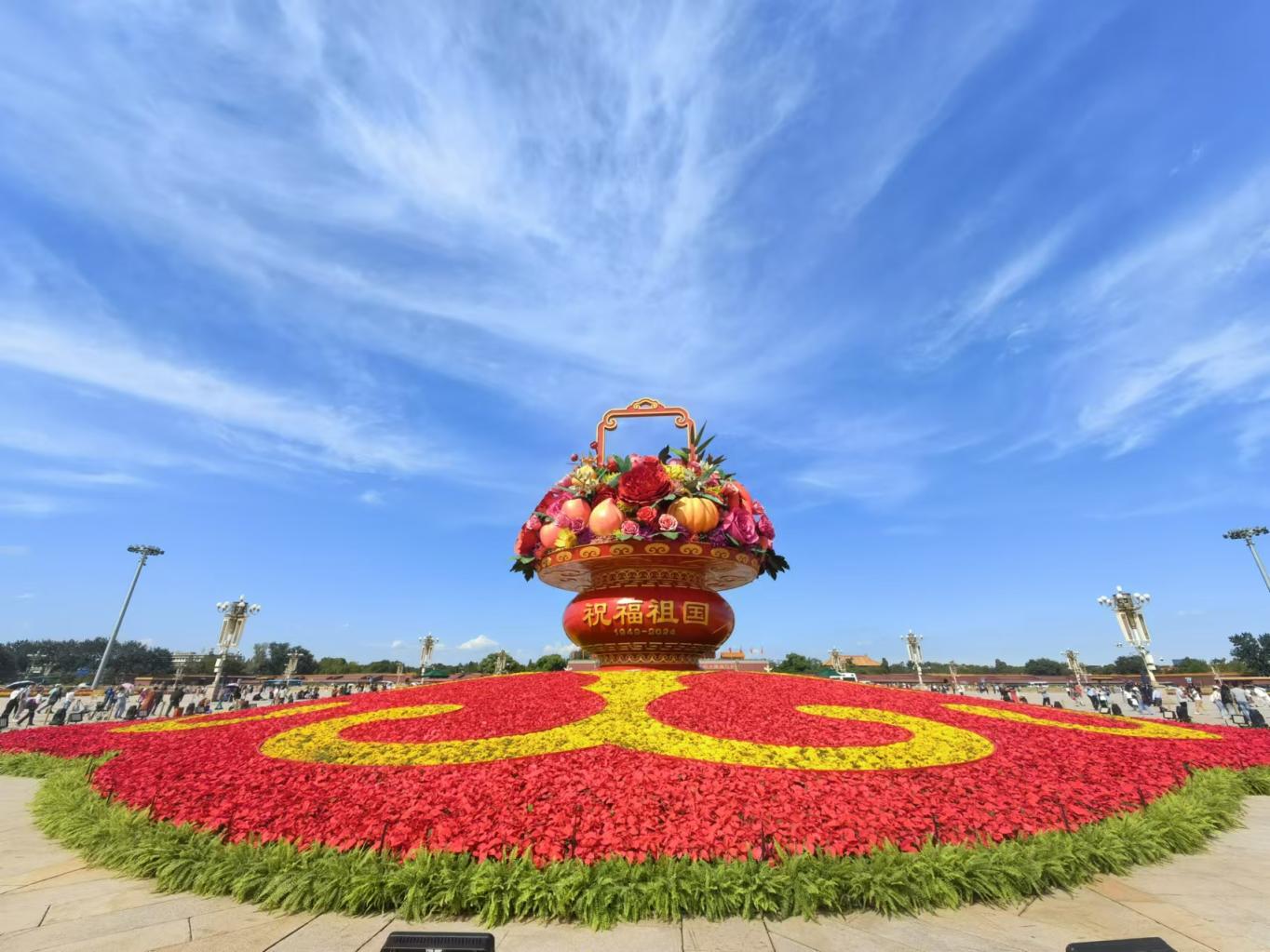 据了解,“祝福祖国”花坛底部直径45米,为如意图案,寓意吉祥如意、国泰民安。花坛顶高18米,篮体高16米,篮盘直径12米。篮体南侧书写着“祝福祖国,1949-2024”字样,篮体北侧书写“普天同庆,1949-2024”字样。两侧绿地延续吉祥如意花带布置方式,花卉布置总面积5050平方米,两侧花球共18个。