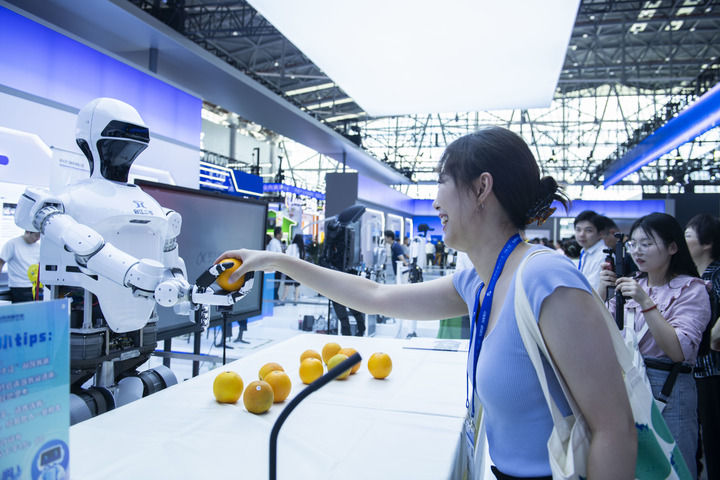 9月20日,在2024世界制造业大会展馆内,人形机器人启江二号抓取橙子递给参观者。新华社记者 黄博涵 摄